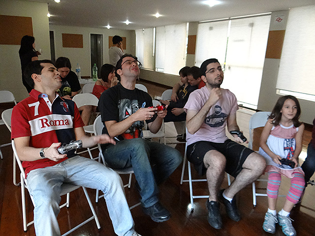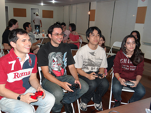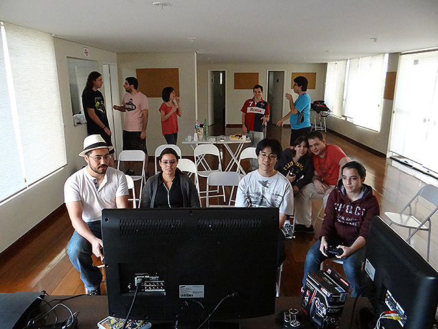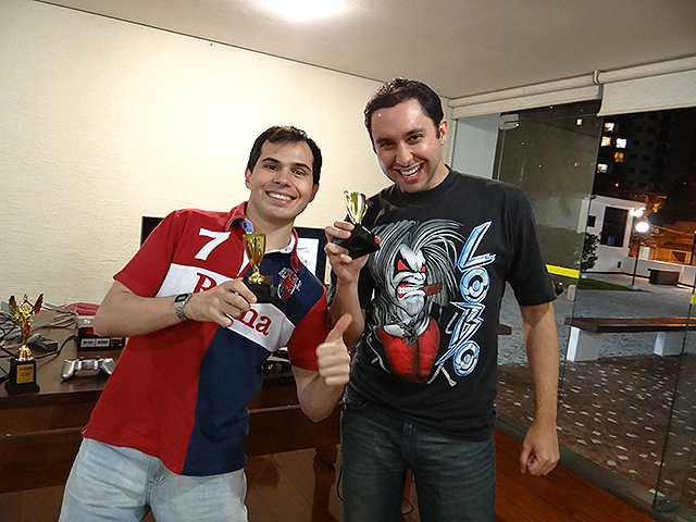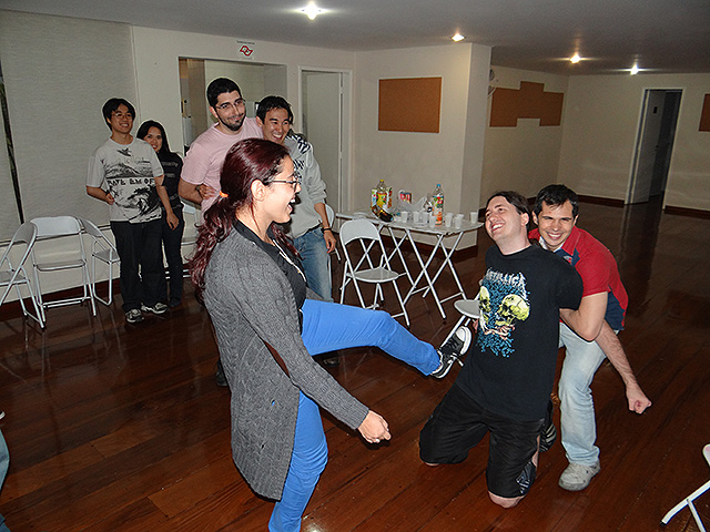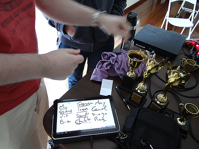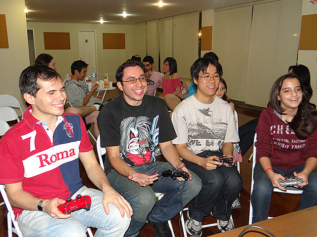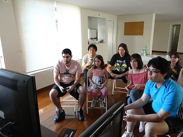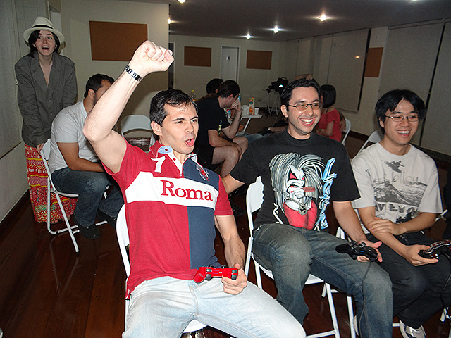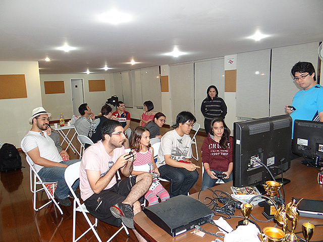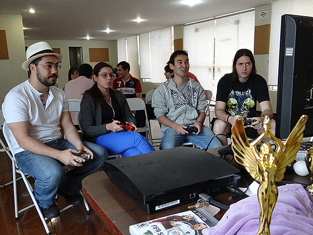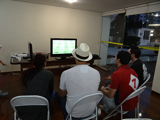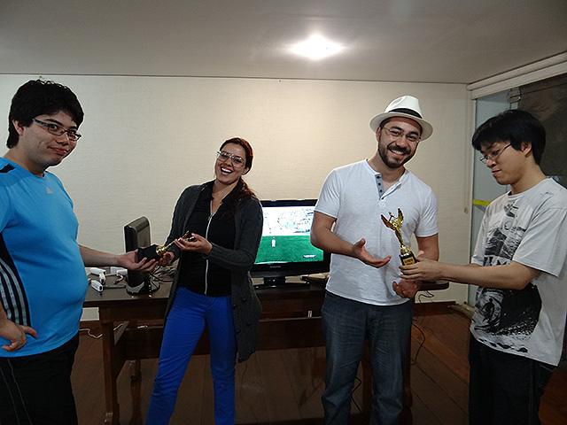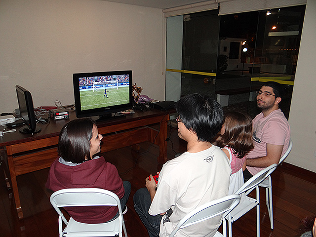 Para variar um pouco utilizamos o jogo FIFA 12 do Playstation 3 e novamente separamos os competidores em duplas que foram separadas em dois grupos com três equipes cada.